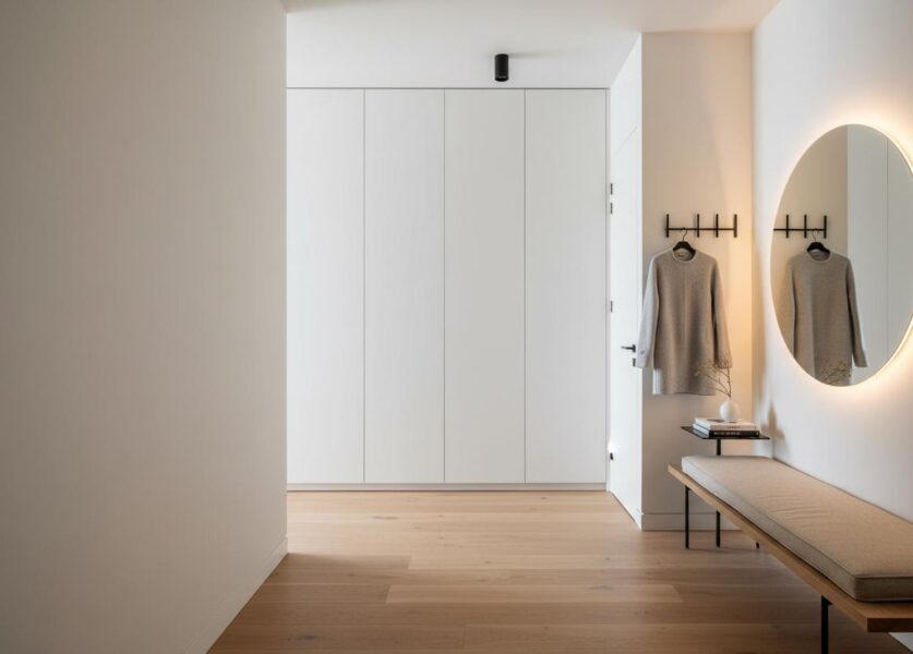 Portal de diseño vanguardista con solado de gres porcelánico o granito con paramentos verticales decorados con pintura y espejo.