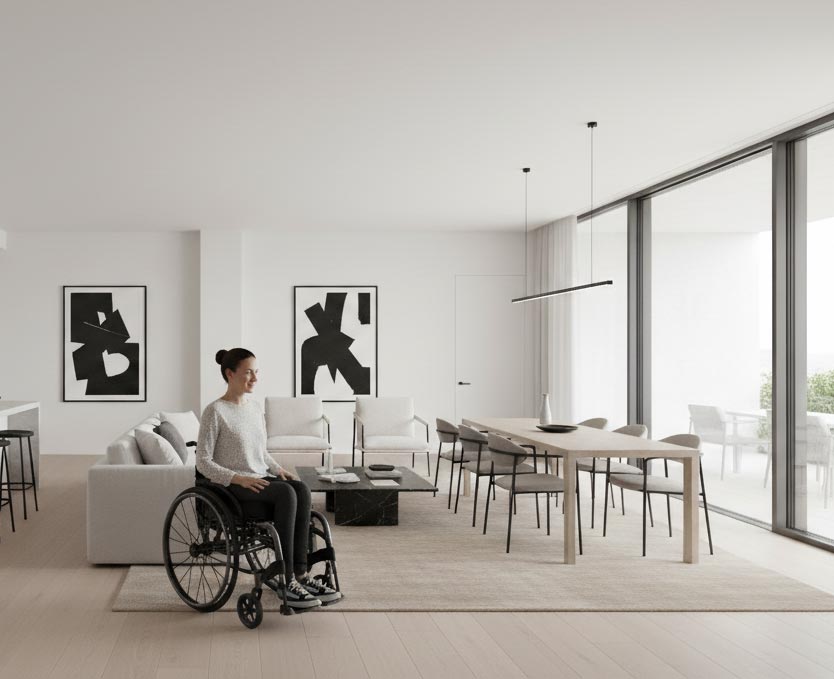 Pensando en todos, ofrecemos tres exclusivas viviendas accesibles de dos dormitorios. Estos hogares están cuidadosamente adaptados para garantizar un diseño funcional y una total autonomía.